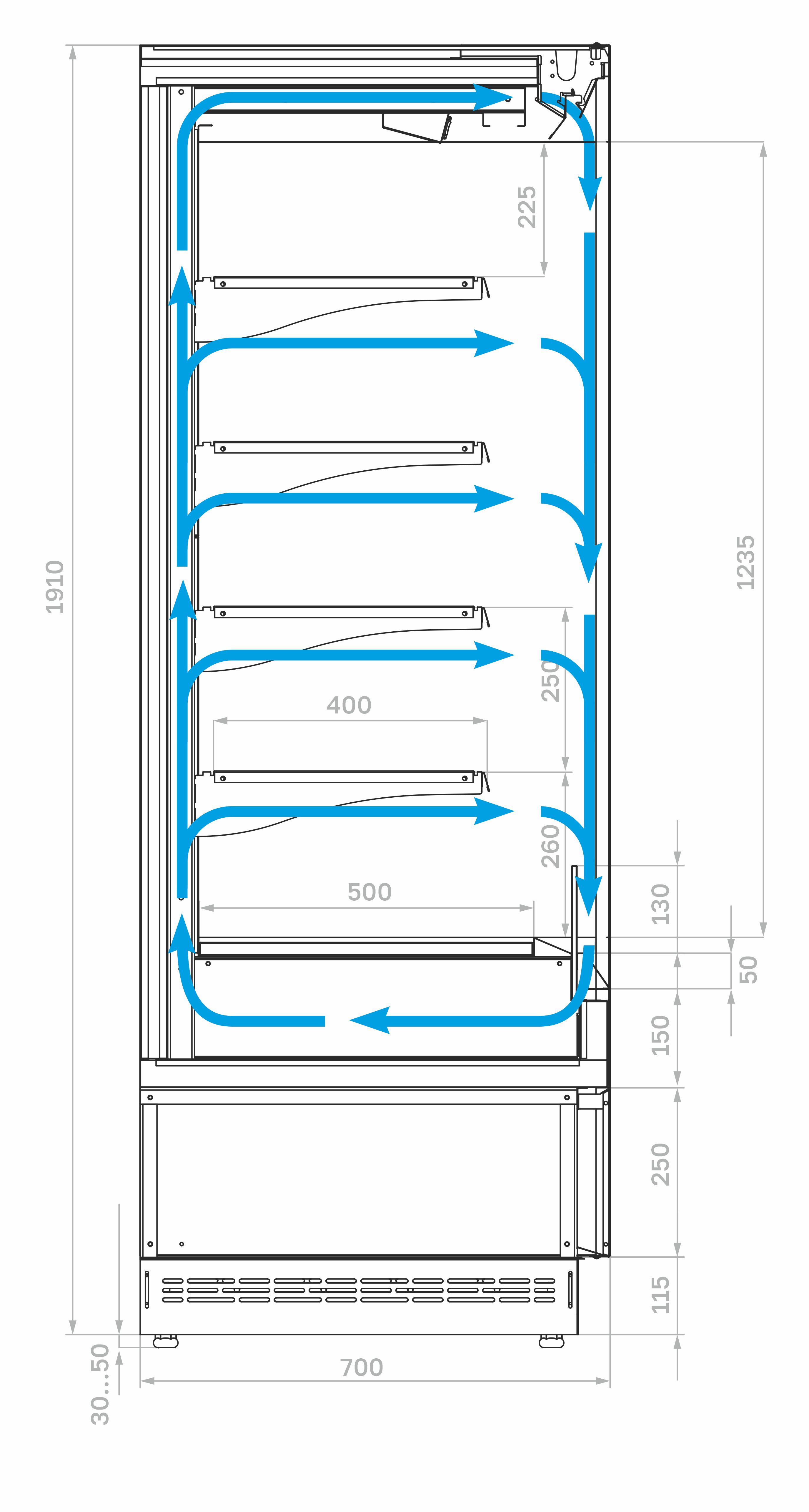 Модель оснащена 4 рядами навесных полок с кронштейнами, 1 распашной дверью, подставкой с фронтальной термовыводящей и цокольной решетками. Корпус прямоугольной формы изготовлен из стали с антикоррозийным покрытием: внешние панели, полки и кронштейны — нержавеющая сталь, цоколь и интерьер — черного цвета