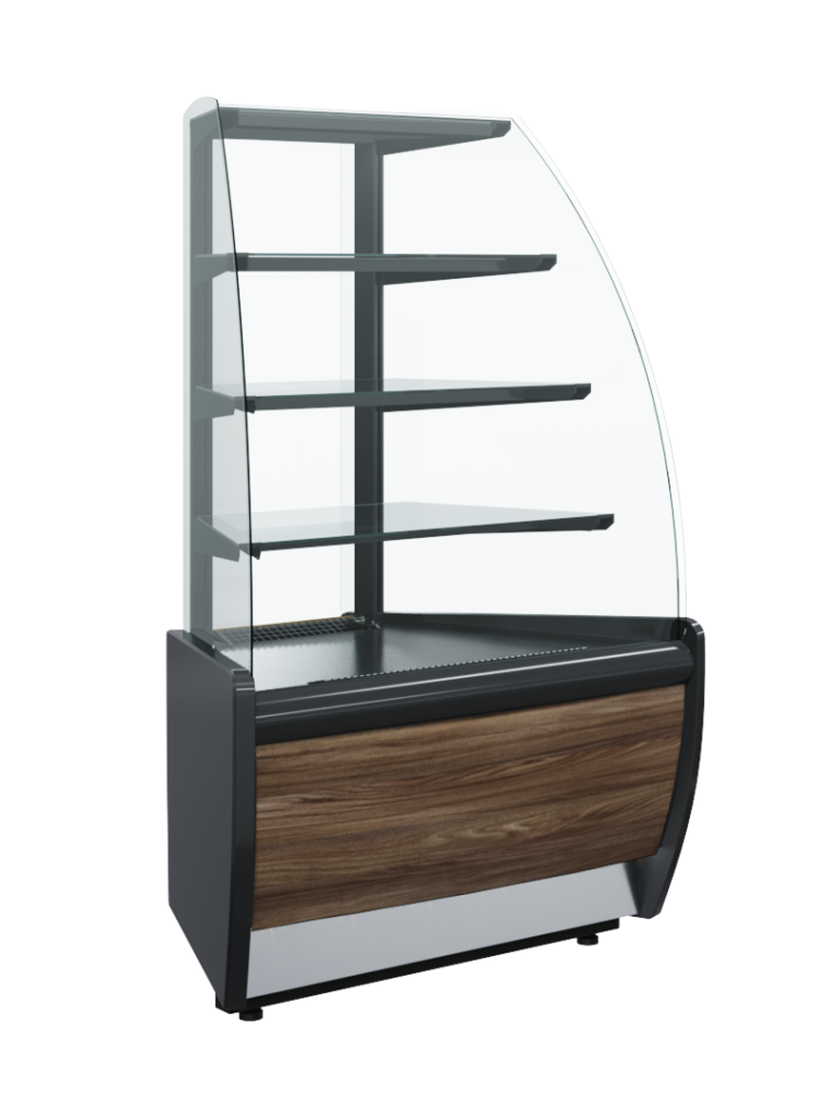 Витрина кондитерская Carboma K70 N-3 Light Паттерн (0108 Темный дуб) угловая предназначена для кратковременного хранения и эффектной демонстрации кондитерских изделий, напитков и готовых блюд. Благодаря динамической системе охлаждения обеспечивается стабильное и равномерное распределение температуры по всей внутренней камере, что важно для сохранения свежести продукции.