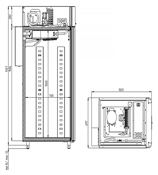 Каталог оборудования Холодильное оборудованиеШкафы холодильныеСпециализированные холодильные шкафыШкаф холодильный для хлебопекарных производств Polair CS107-Bakery Br со стеклом (Тип 2) Шкаф холодильный для хлебопекарных производств Polair CS107-Bakery Br со стеклом (Тип 2) Код товара: 062-623 Поделиться: WhatsAppTelegram СравнитьДобавить в КПВ избранное 0 419 900 ₽ В корзину 0 шт Под заказСамовывоз сегодня бесплатно Взять в кредит Купить в лизинг Получить консультацию в WhatsApp Описание Характеристики Отзывы 0 Инструкции 5 Шкаф холодильный для хлебопекарных производств Polair CS107-Bakery Br со стеклом (Тип 2) предназначен для создания оптимальных условий хранения и расстойки заготовок из теста на предприятиях общественного питания и торговли. Корпус цельнозаливной, выполнен из нержавеющей стали, дверь — стеклопакет. Оборудование стабильно работает при температуре окружающей среды до +40 °C. В комплект входят 20 пар направляющих размером 400×600 мм. Особенности: Многофункциональные режимы: охлаждение тестовых заготовок, замедление ферментации, хранение, регенерация, брожение и расстойка Динамическое охлаждение с мягким обдувом без заветривания и автоматическая оттайка с системой испарения конденсата Панель управления с 7" дисплеем: контроль температуры, влажности (регулируется от 60 до 95 %), скорости вентилятора и времени, возможность создания и сохранения собственных программ Встроенный ультразвуковой увлажнитель (требуется подключение к системе водоочистки и канализации) Эргономичная конструкция: верхнее расположение агрегата, распашная дверь со стеклопакетом и механизмом самозакрывания, педаль для удобного открытия, съёмные направляющие и легко заменяемый уплотнитель с магнитной вставкой Простота ухода: штампованное углубление в дне корпуса для сбора загрязнений Экологичный хладагент R290 Энергоэффективность: потребляемая мощность — 0,55 кВт (охлаждение), 0,9 кВт (нагрев) Толщина стенки корпуса — 43 мм Polair CS107-Bakery Br со стеклом (Тип 2) — современный шкаф отложенной расстойки, обеспечивающий полный контроль и гибкость при работе с тестовыми заготовками. Благодаря многофункциональным режимам, точной настройке параметров и продуманной конструкции, он становится надёжным решением для пекарен и кондитерских, стремящихся к высокому качеству продукции и удобству в эксплуатации.Изображение товара, представленного на фото, может отличаться от его фактического вида. Показать все Габаритные размеры697×1005×1960 ммДиапазон рабочей температурыот -10 до +40 °CДлина697 ммШирина1005 ммВысота1960 ммОбъём700 лКол-во дверей1 Тип двериСтеклянная Уровень влажностиот 60 до 95 %Направляющие под EN 40*6020 Расстояние между направляющими60 ммХолодильный агрегатВстроенный Тип оттайкиАвтоматическая Тип охлажденияДинамический ПодсветкаЕсть ХладагентR290 Вес нетто180 кгВес брутто205 кгБрендPolairВсе специализированные холодильные шкафы Из нержавейки Оставить отзыв Еще никто не оставил отзыв на этот товар Схема POLAIR CS107 Bakery Br.jpgИнструкция на POLAIR CS107 Bakery Br.pdfБрошюра на хлебопекарное оборудование POLAIR.pdfДекларация о соответствии.pdfСертификат соответствия.pdf Похожие товары Перейти в каталог В наличии 403 670 ₽ Шкаф холодильный для хлебопекарных производств Polair CS107 Bakery Br (Тип 2) В наличии 405 365 ₽ Шкаф холодильный для хлебопекарных производств Polair CS107 Bakery Br черный, со стеклом (Тип 2) Под заказ 169 915 ₽ Шкаф холодильный