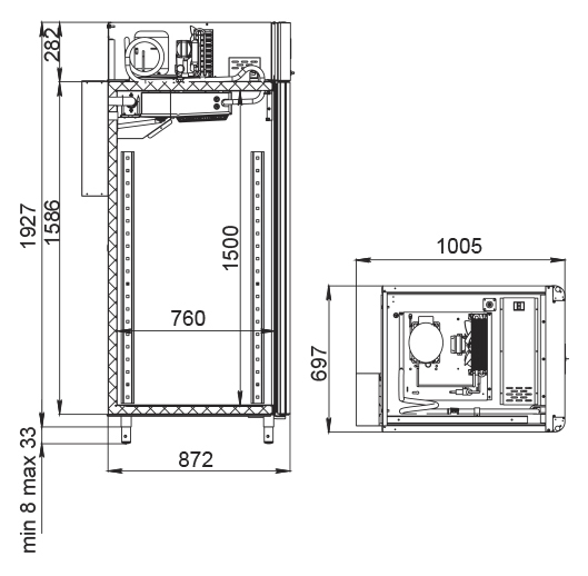 Каталог оборудования Холодильное оборудованиеШкафы холодильныеСпециализированные холодильные шкафыШкаф холодильный для вызревания сыра Polair CS107 Cheese полки нерж. Шкаф холодильный для вызревания сыра Polair CS107 Cheese полки нерж. Код товара: 062-628 Поделиться: WhatsAppTelegram СравнитьДобавить в КПВ избранное 0 391 000 ₽ В корзину 0 шт Под заказСамовывоз сегодня бесплатно Взять в кредит Купить в лизинг Получить консультацию в WhatsApp Описание Характеристики Отзывы 0 Инструкции 5 Шкаф холодильный для вызревания сыра Polair CS107 Cheese полки нерж. предназначен для создания оптимальных условий хранения и дозревания твердых и полутвердых сыров на предприятиях общественного питания и торговли. Монолитный цельнозаливной корпус выполнен из нержавеющей стали снаружи и изнутри (кроме задней стенки), что обеспечивает высокую механическую прочность и долговечность шкафа. Оборудование рассчитано на работу при температуре окружающей среды до 40 °С. Особенности: Верхнее расположение агрегата Многофункциональная русифицированная контрольная панель с 5-дюймовым дисплеем Возможность создания и сохранения собственных программ в памяти электронного блока Четыре перфорированные полки из нержавеющей стали Встроенный ультразвуковой увлажнитель (требуется подключение к системе подачи очищенной воды и централизованной канализации) Распашная дверь с заливной теплоизоляцией Заменяемый уплотнитель двери с магнитной вставкой Встроенная ручка для удобства открытия Отключаемая внутренняя LED-подсветка Штампованное углубление в дне корпуса для облегчения ухода Надежный замок Педаль для бесконтактного открывания двери Регулировка уровня влажности от 60% до 95% Максимальная нагрузка на каждую полку — 40 кг Толщина стенок корпуса — 43 мм Polair CS107 Cheese полки нерж. — это современный и надежный холодильный шкаф, который обеспечивает идеальные условия для хранения и дозревания твердых и полутвердых сыров. Прочный корпус, точное управление влажностью и температурой, а также удобство эксплуатации делают его отличным решением для предприятий общественного питания и торговли, стремящихся сохранить качество и вкусовые свойства сырной продукции.Изображение товара, представленного на фото, может отличаться от его фактического вида. Показать все Габаритные размеры697×1005×1960 ммДиапазон рабочей температурыот -2 до +30 °CДлина697 ммШирина1005 ммВысота1960 ммОбъём700 лКол-во дверей1 Тип двериМеталлическая Количество полок4 штДопустимая нагрузка на полку40 кгУровень влажностиот 60 до 95 %Холодильный агрегатВстроенный Тип оттайкиАвтоматическая Тип охлажденияДинамическое ПодсветкаЕсть ХладагентR290 Вес нетто144 кгВес брутто171 кгБрендPolairВсе специализированные холодильные шкафы Из нержавейки Оставить отзыв Еще никто не оставил отзыв на этот товар Схема POLAIR CS107 Cheese.jpgИнструкция на POLAIR CS107 Cheese.pdfБрошюра на POLAIR CS107 Cheese.pdfДекларация о соответствии.pdfСертификат соответствия.pdf Похожие товары Перейти в каталог Под заказ 385 050 ₽ Шкаф холодильный для вызревания салями Polair CS107 Salami со стеклом Под заказ 207 942 ₽ Шкаф холодильный HURAKAN HKN-MA350 для созревания мяса В наличии 403 670 ₽ Шкаф холодильный для хлебопекарных производств Polair CS107 Bakery Br (Тип 2) Под заказ 399 500 ₽ Шкаф холодильный для вызревания мяса Polair CS107 Meat со стеклом (Тип 1) Под заказ 248 490 ₽ Шкаф холодильный для вызревания мяса и сыра Carboma M700GN-1-G-MHC 9006 Под заказ 389 300