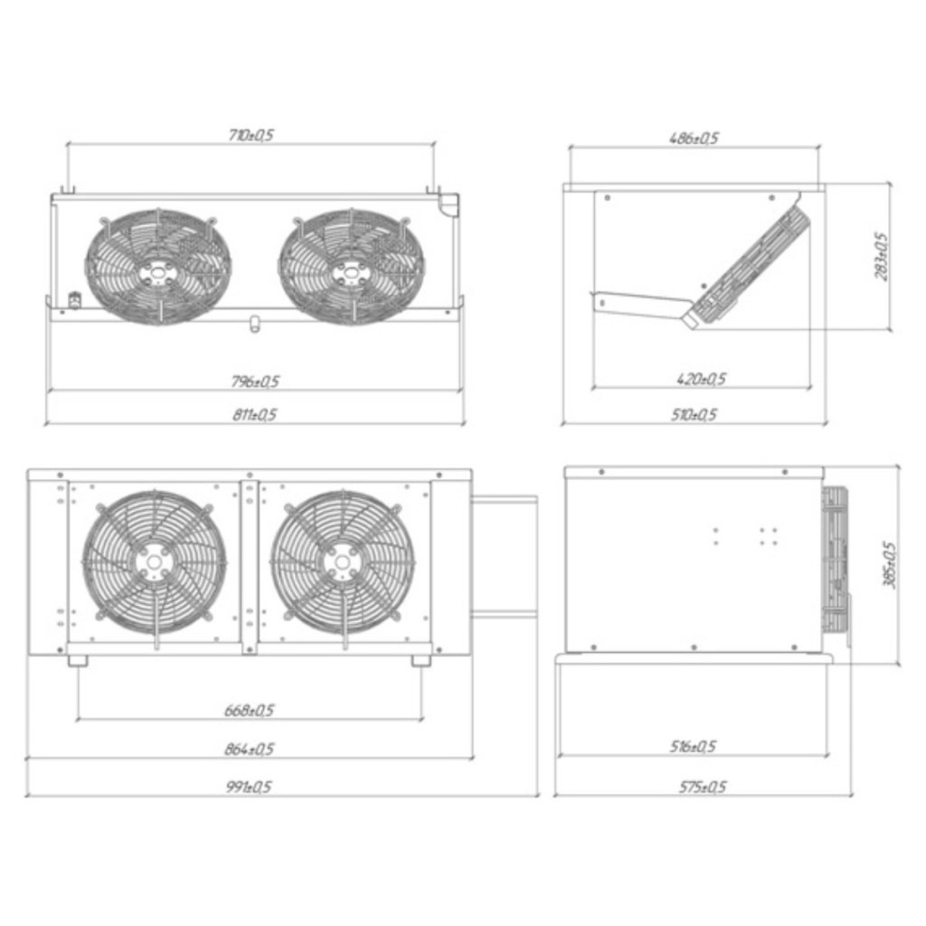 Воздухоохладитель: два вентилятора Ø 250 мм, шаг ребер — 4,2 мм, дальность струи — до 7 м, расход воздуха — 1200 м³/ч