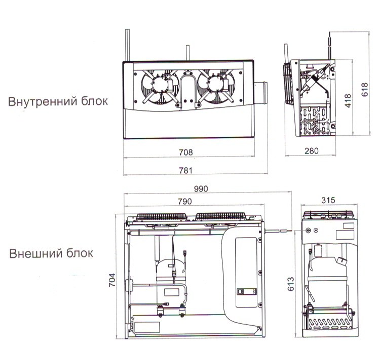 Комплектация внутренний блок (испаритель, вентилятор, отделитель жидкости), наружный блок (компрессор с пускозащитной аппаратурой, конденсатор, фильтр-осушитель, электрический блок управления), светодиодный светильник, кабель 3 м для подключения к автоматическому выключателю, кабель 5 м для подключения светильника и выключателя в камере, монтажный комплект креплений.