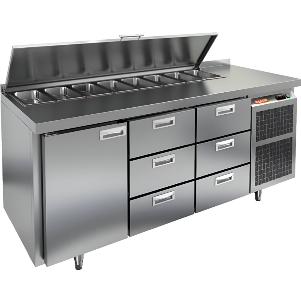 Каталог оборудования Холодильное оборудованиеСтолы охлаждаемыеСтолы холодильные для салатовСтол холодильный для салатов HiCold SL1-133GN (1/3) с крышкой Стол холодильный для салатов HiCold SL1-133GN (1/3) с крышкой Код товара: 064-848 Поделиться: WhatsAppTelegram СравнитьДобавить в КПВ избранное 0 209 962 ₽ В корзину 0 шт Под заказСамовывоз сегодня бесплатно Взять в кредит Купить в лизинг Получить консультацию в WhatsApp Описание Характеристики Отзывы 0 Стол холодильный для салатов HiCold SL1-133GN (1/3) предназначен для использования на предприятиях общественного питания и торговли. Он объединяет рабочую поверхность и охлаждаемый отсек, что делает его удобным решением для хранения, охлаждения и подготовки ингредиентов при приготовлении салатов, пиццы и других блюд. Такая конструкция позволяет повару работать быстрее и эффективнее, так как все необходимые продукты находятся под рукой. Корпус и столешница выполнены из прочной нержавеющей стали, устойчивой к коррозии и легко поддающейся санитарной обработке. Металлическая крышка защищает продукты от загрязнений и сохраняет их свежесть. Особенности модели: Электронная панель управления — точная настройка температурного режима. 1 глухая дверь — удобный доступ к холодильному отсеку. 6 выдвижных ящика — быстрое размещение и замена продуктов. Вместимость салат-бара — до 8 гастроемкостей глубиной до 100 мм. Автоматические доводчики дверей с фиксацией в открытом положении. Легкозаменяемые магнитные уплотнители — надежная герметичность. Открытая агрегатная часть — быстрый доступ для обслуживания. Регулируемые по высоте ножки — устойчивость даже на неровном полу. Толщина столешницы, борта и теплоизоляции — 50 мм, что обеспечивает прочность и энергоэффективность конструкции. HiCold SL1-133GN (1/3) — практичное и удобное решение для профессиональной кухни, обеспечивающее удобную подготовку и хранение ингредиентов. Изображение товара, представленного на фото, может отличаться от его фактического вида. Показать все Габаритные размеры1835×700×850 ммДиапазон рабочей температурыот +2 до +10 °CРасположение агрегатаБоковое Материал столешницыНержавеющая Тип столаС дверьми и ящиками Тип двериГлухая Объём505 лКоличество дверей1 штТип гастроемкостейGN 1/3 Количество ящиков6 штРазмер полки530×325 ммНапряжение220 ВМощность0,46 кВтТип охлажденияДинамическое Тип оттайкиАвтоматическая СтолешницаС бортом Габариты в упаковке2000×850×1000 ммВес нетто130 кгВес брутто185 кгБрендHicold Оставить отзыв Еще никто не оставил отзыв на этот товар Ранее просмотрено Под заказ 170 902 ₽ Стол холодильный для салатов HiCold SLE3-111GN полипропилен, без крышки Под заказ 204 922 ₽ Стол холодильный для салатов HiCold SL1-22GN (1/3) О с крышкой