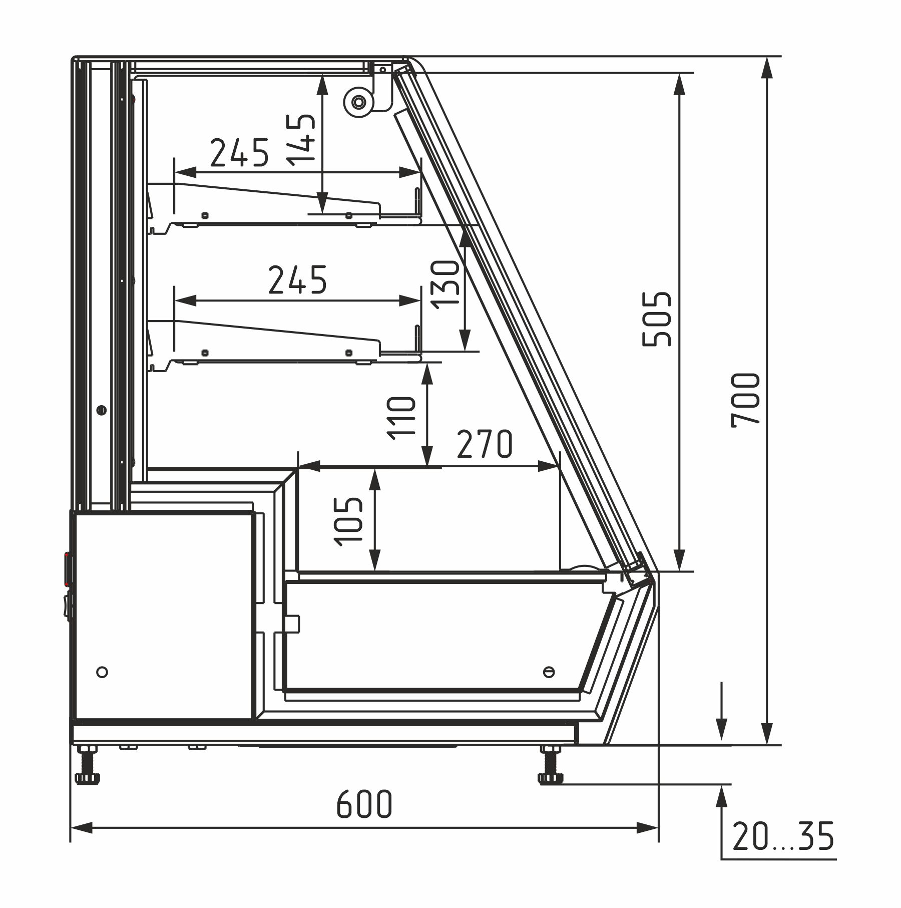 • Высота выкладки: до 150 мм на нижнем поддоне, до 100 мм на полках.